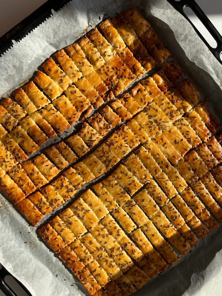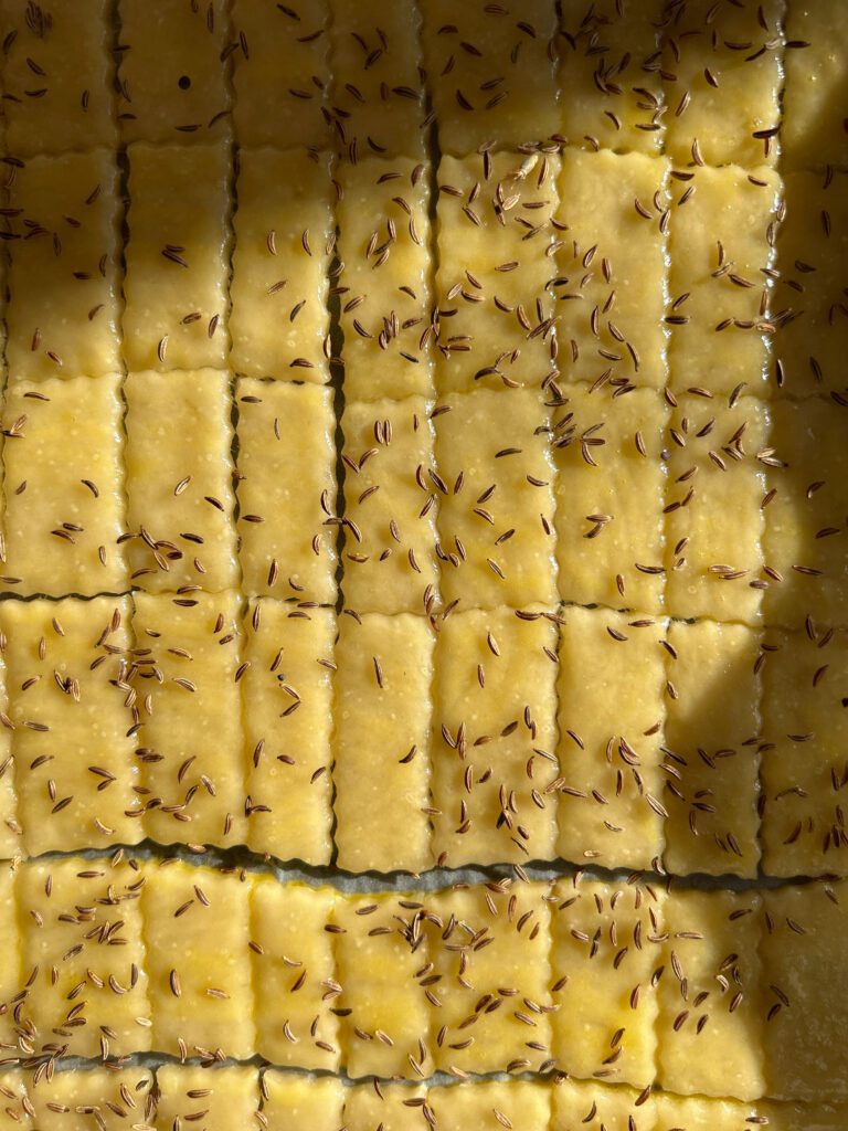 - Luăm foaia de hârtie de deasupra și cu un roller sau cuțit tăiem dreptunghiuri (sau ce formă dorim). Ungem cu ou bătut și presărăm chimen, mac, susan etc.